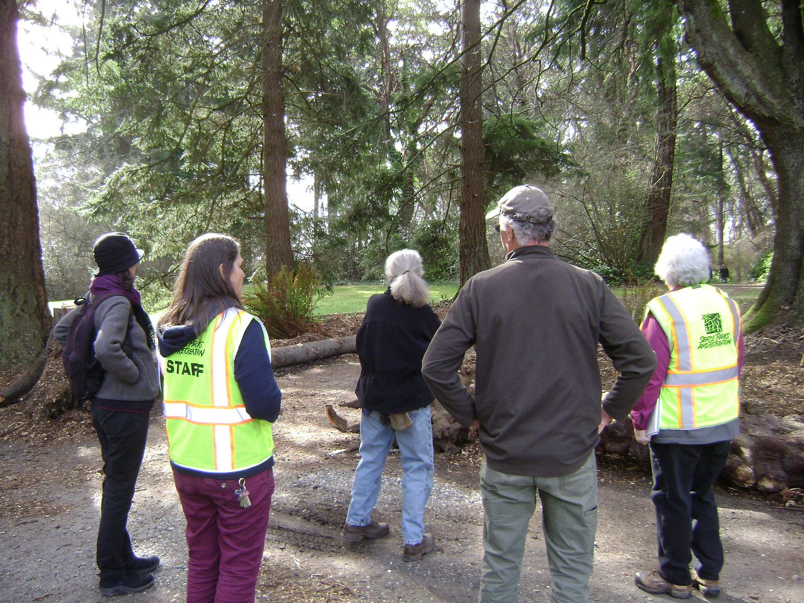 Into the woods we went, for a meeting of the Lincoln Park Habitat Committee. You have to feel lucky when your meeting happens outdoors, and especially when it’s on a sunny winter day in Seattle.