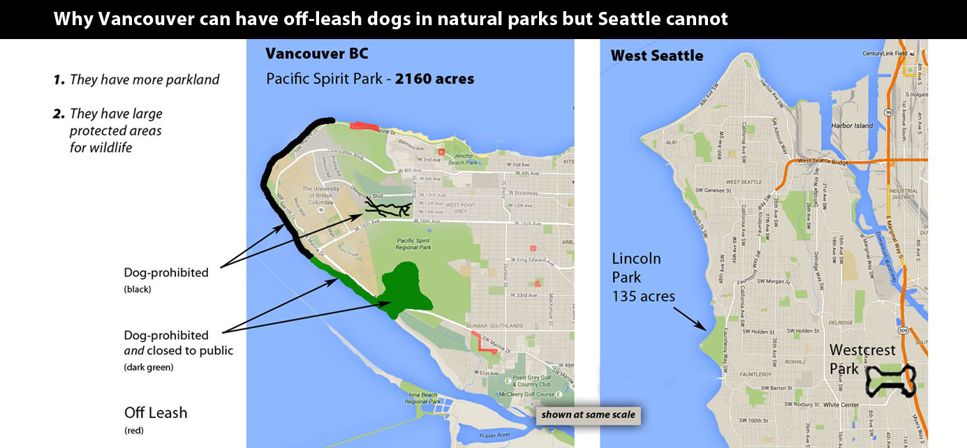 Additionally, we are concerned that the Off-leash advocates have based a good deal of their argument on what other cities have—but they are not making fair comparisons. For example, in the both the Focus Groups, the Park Board meeting, and in various Facebook Postings to their members, they have portrayed Vancouver BC as having off-leash opportunities on beaches and trails—something they say we should have also. But, the two cities are not comparable. Vancouver has much more parkland per city acre and more protected environmentally sensitive areas such as Puget Sound beaches and forests, including large spaces where dogs and the public are not allowed at all—a vital buffer for wildlife and mitigation for OLAs. See attached maps which show visually the great differences between Seattle and Vancouver.
