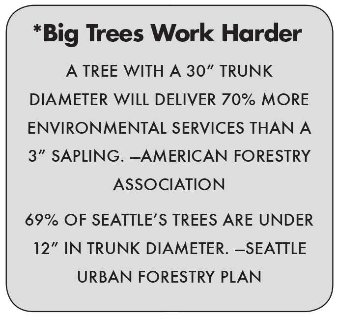 For many residents and visitors, Seattle is a city of trees. Trees are, after all, why Seattle was founded — the loggers came because we grew some of the biggest trees in the world right here in temperate lowlands of the Pacific Northwest. Our big trees are why we are known as the Emerald City. The tree is the international symbol of sustainability and the green movement — two things to which Seattleites aspire.