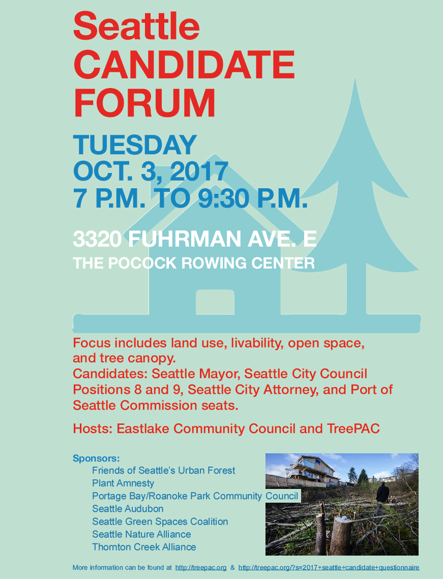 Come to the Seattle Candidate Forum Tuesday evening, October 3rd, to hear what Seattle’s candidates have to say about issues concerning land use, livability, open space, and protecting/expanding our city’s tree canopy and urban forest. It is your opportunity to be informed when you go to the polls in November and make your vote count. Learn more…